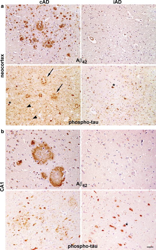 Figure 1. Examples of “the cerebral neocortex (a) and CA1 hippocampus (b) of Aβ42 (21F12 antibody) versus phospho-tau (AT8 antibody) staining of an unimmunised AD control (cAD) and an immunised AD case (iAD). From (2).
