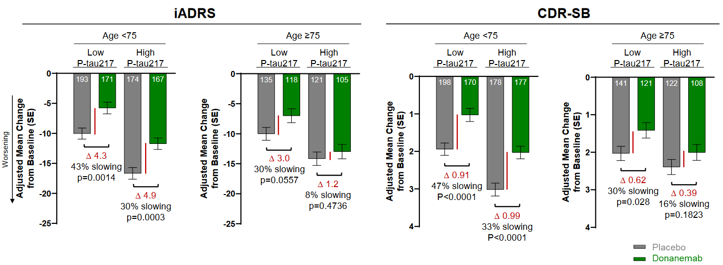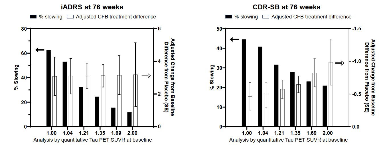 In a presentation at CTAD, scientists from the trial team presented a more granular analysis, ranking the patients into six groups ranging from those with the lowest burden of tau aggregates in their brains to those with the highest. This stronger gradient showed even more clearly the benefit of clearing beta-amyloid before it drives too much progression of aberrant tau. While the antibody benefited people across the full range of tau aggregate scores, donanemab had the clearest effect in people who started the trial with the lowest burden of tau aggregates in their brains (SUVR 1). In such low-tau aggregate people, donanemab slowed functional and cognitive decline by a remarkable 60% on the iADRS and 45% on the CDR-SB!