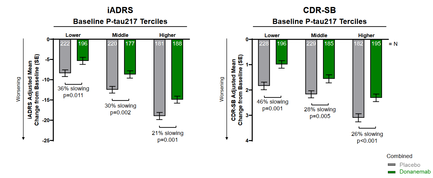 In the original Phase III trial for donanemab, the researchers didn’t just compare all the subjects who received the antibody to those who received the placebo, but also compared people who received the treatment and who had “moderate” levels of tau aggregates in their brains to all the treated subjects combined (that is, those with moderate levels plus those with high levels together).*