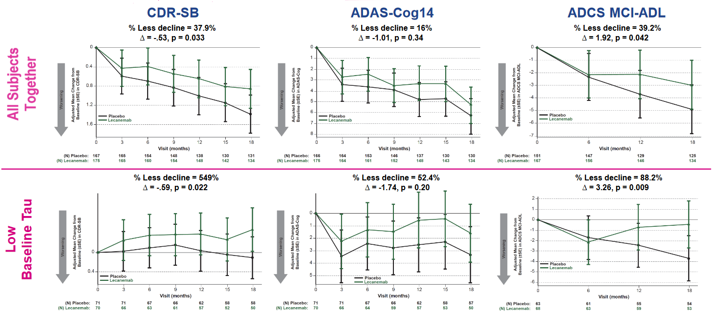 And remarkably, lecanemab not only slowed down cognitive decline more in people in the low-aberrant tau subgroup than in the overall substudy population, but appeared to actually claw back lost cognitive function! We can’t say this with complete confidence because the small numbers of people in the study created opportunity for artifacts. But it certainly looks as if people whose brains had relatively low levels of existing tau damage and who received lecanemab ended the trial with better cognitive function than they began with, as measured on the CDR-SB test.