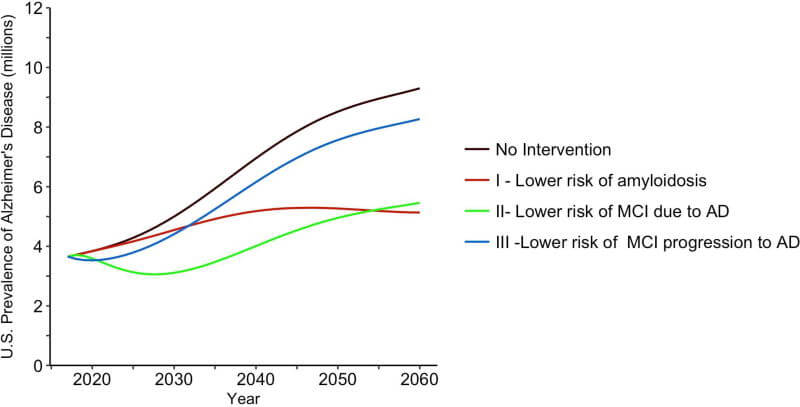 Second, while the rate at which older people are being diagnosed with Alzheimer’s at a given age is overall staying flat, the total number of older people is increasing due to our successes in combatting cardiovascular disease and other specific causes of death. As a result, the total number of people suffering with Alzheimer’s is unambiguously going up, as is the share of them in the overall population, and it will continue to do so for decades to come if nothing changes. This adds societal urgency to the call to test and (when we can) to treat, so as to prevent a tsunami of personal grief and burden on the economy and a healthcare system that is already showing strain. Indeed, projections from 2018 — before we even had proven AmyloSENS interventions against beta-amyloid — show the enormous potential of such therapies to hold the line against the coming wave.