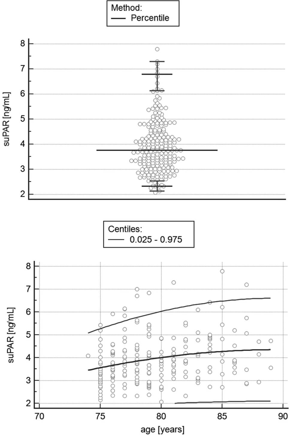 Since suPAR is also a constituent of the SASP, scientists at the Memorial Sloan Kettering Cancer Center wondered if it might function as a senescent cell biomarker. They noted that other researchers had reported that people with a range of diseases in which senescent cells play a prominent role have elevated uPAR and/or suPAR levels, including diabetes, osteoarthritis, and idiopathic pulmonary fibrosis (a terrible disease of the aging lung), and that suPAR is actually used as a severity biomarker in both diabetes and kidney disease. Although it’s only available for research purposes in the United States, there’s even a commercial test for suPAR geared toward using it as a biomarker for the progression of many of these diseases. It is furthermore known that suPAR levels rise with age, although the slope of the rise with age is gentle, the average varies considerably, and it ultimately tends to plateau.