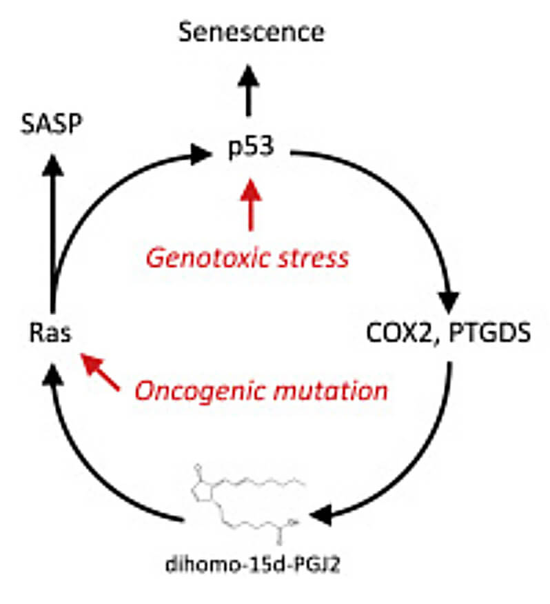 But d15P is different: senescent cells produce this unusual lipid mediator, but then hold it inside themselves. It turns out that d15P plays a role in both pushing the cell into the senescent state, and keeping it there — and also in promoting many components of the SASP. This turns into a self-reinforcing cycle, in which d15P enforces senescence through the cell fate regulator p53 — but then p53 promotes the production of a critical enzyme involved in eicosanoid synthesis, which sustains the production of d15P.