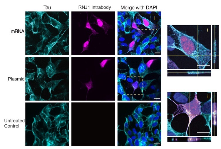 Meanwhile, the intrabody version of RNJ1 remained within the neuron-like cells. Promisingly, the cells produced more of the RNJ1 intrabody from mRNA than they did when the same intrabody was encoded in a plasmid, which is a more conventional lab technique for producing proteins in the main body of the cell.