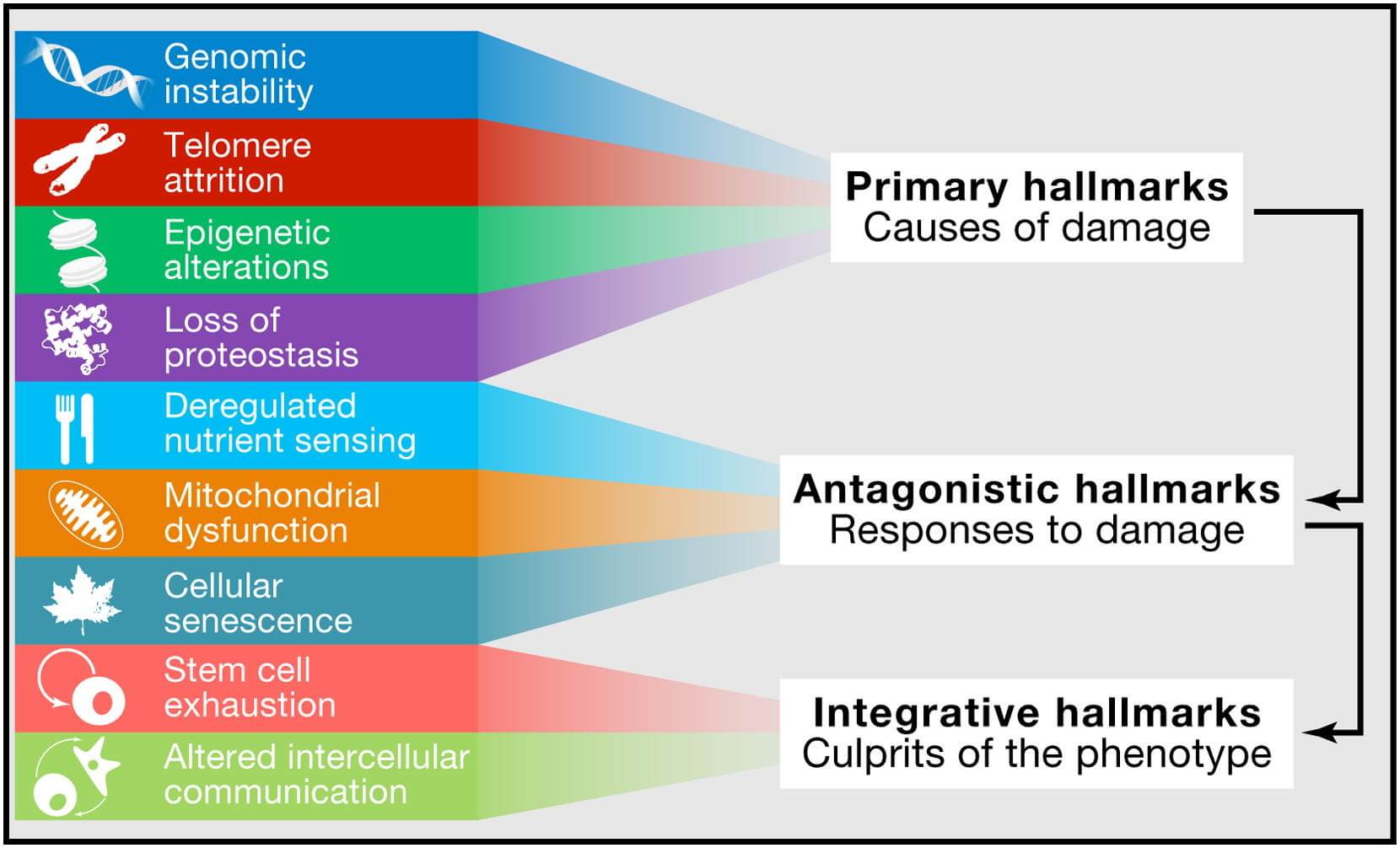 With those criteria in hand, the authors wound up with “nine hallmarks of aging [that] are grouped into three categories”: primary Hallmarks, compensatory (or antagonistic) Hallmarks, and integrative Hallmarks.