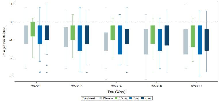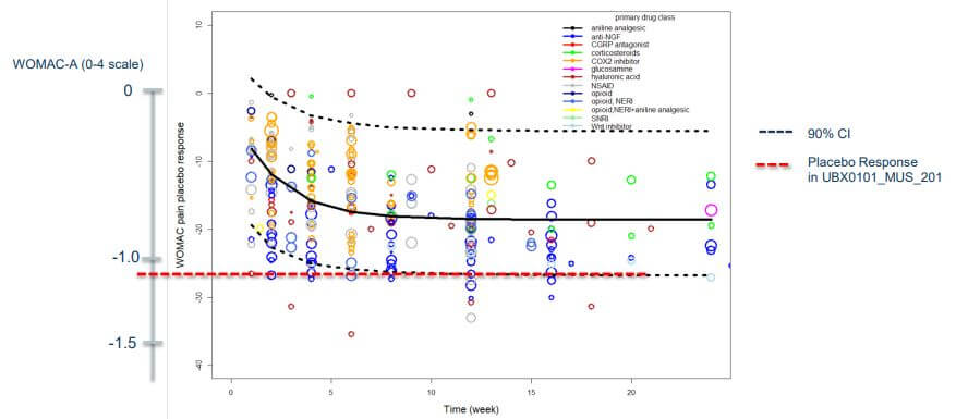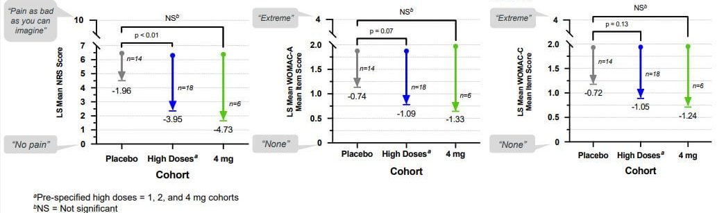 Also, there was something a bit puzzling about the time course in the original Phase I: although there seemed at first glance o be a rapid dose-responsive effect in the first few weeks after the injection, if you look at the graph, it actually looks like the lower doses of the drug were not only no better than the placebo by the end of twelve weeks, but had possibly left recipients in more pain than people getting saline! That doesn’t leave much room for thinking that the Phase II results might have delivered potent pain and functional relief if the investigators had just left the trial running a little bit longer. Plus, to remind you, UNITY included one dose of UBX0101 in the Phase II trial that was even higher than the highest dose they had tested in Phase I.