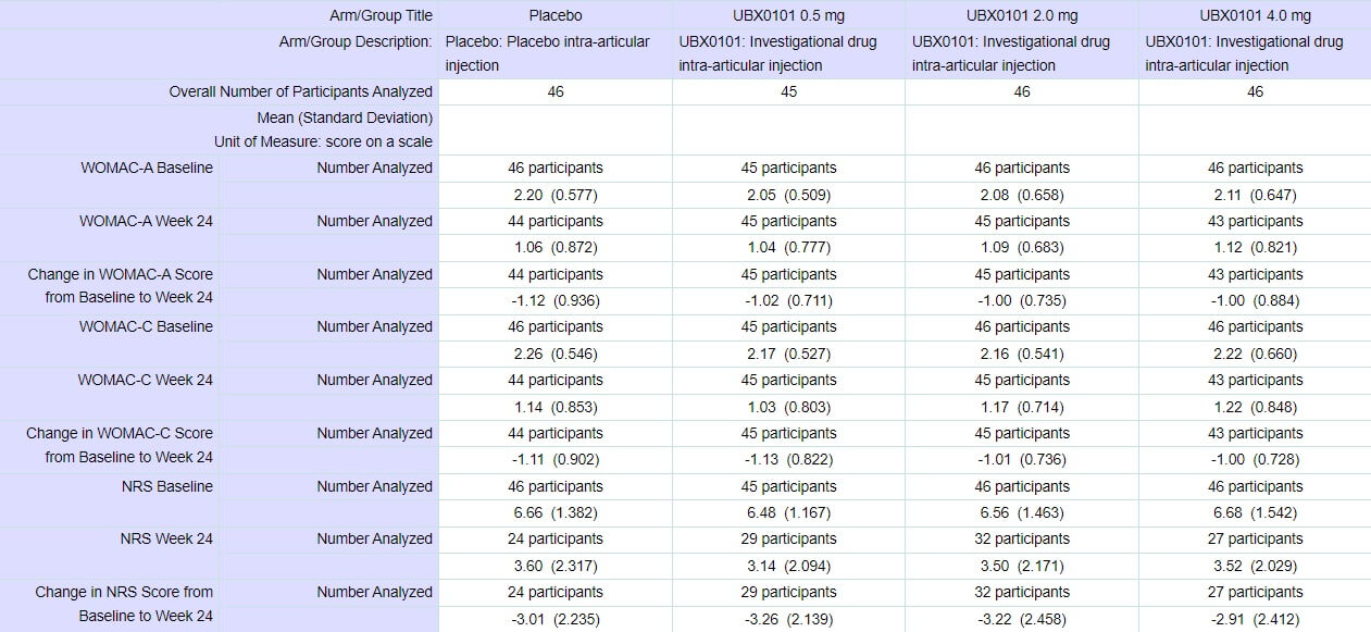So investors and company scientists went into the Phase II trial with bated breath. This trial signed up more people (183 participants) and divided them into fewer dosing groups, including one group randomized to receive an injection of 4 mg of UBX0101 — double the highest dose used in the Phase I trial.