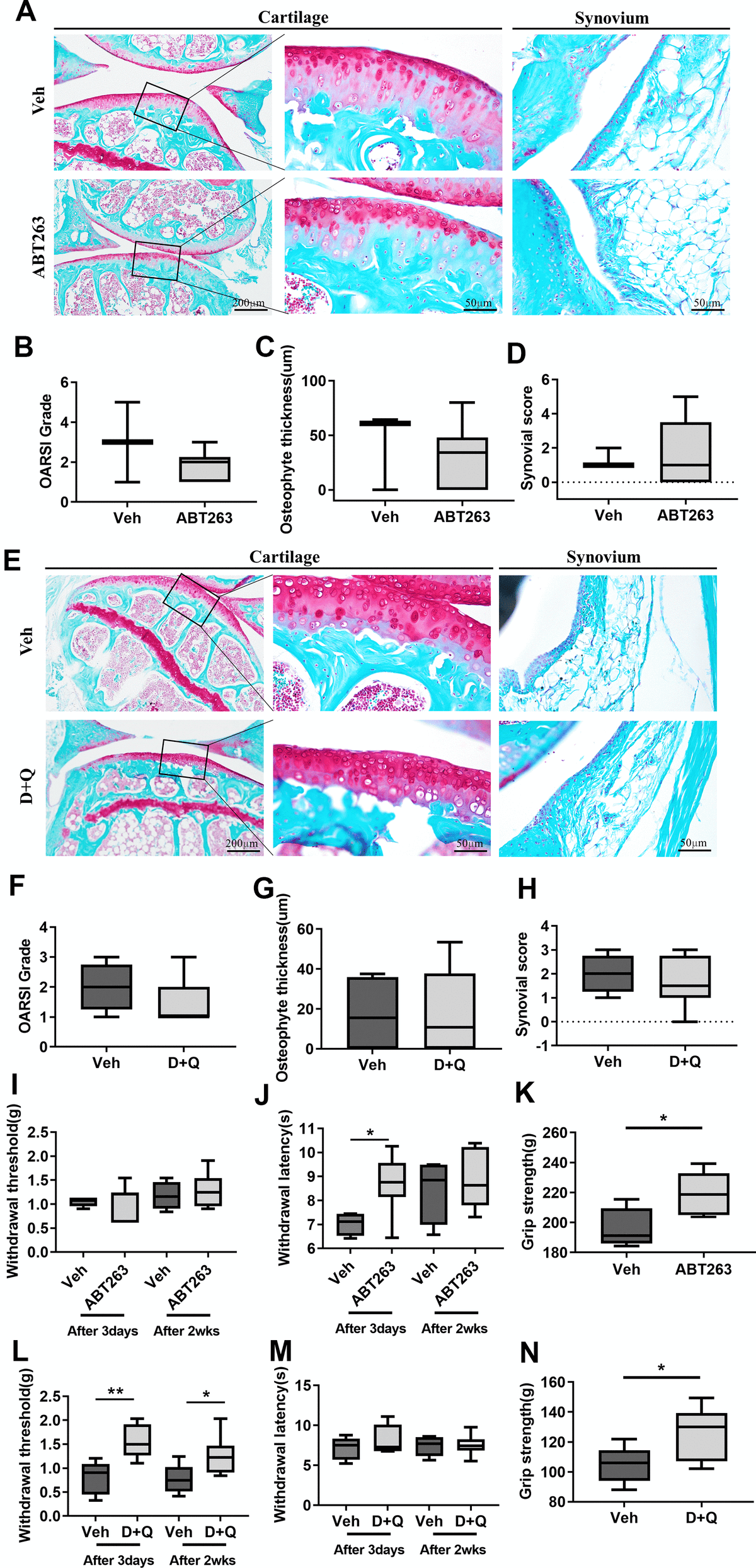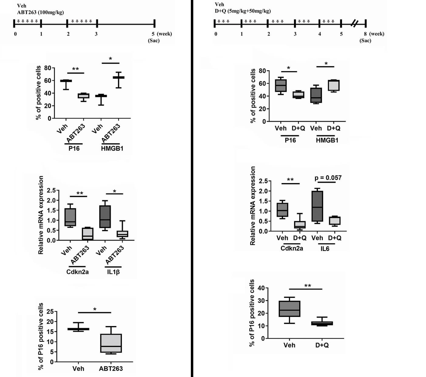 In the first animal study, researchers from Korea University tested the effect of senolytics in the osteoarthritis of aging mice. Mice lived without any intervention until they were 21-22 months old — similar to 75-year-old humans — and then scientists examined their joints after treatment with either a drug-free control injection or one of two well-studied senolytic drugs: navitoclax (also known as ABT-263) or the combination of dasatinib plus quercetin (D+Q). Prior to treatment, these mice had clear evidence of age-related cartilage degeneration and joints infested with senescent cells. Senolytic treatment rained destruction down on the senescent cells in the joint, and by extinguishing the senescent fuel, it cleared the atmosphere of the smoke of SASP.
