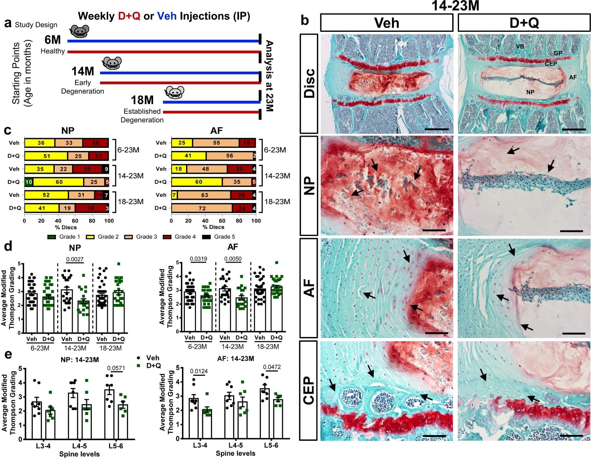 The results in degenerative disc disease were somewhat as we speculated they would be for using senolytics against osteoarthritis at different time points above. Delaying senolytic treatment until the mice were in the equivalent of their 50s or 60s in today’s biological ages failed to improve the animals’ disc degeneration. But starting senolytic treatment when the mice were in young adulthood or mouse middle age substantially preserved the discs’ integrity.