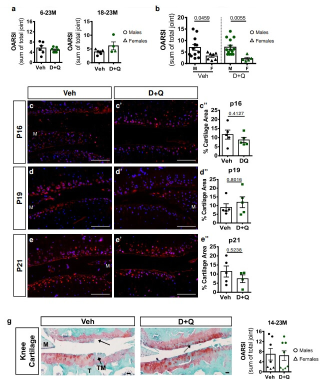 However, the effects in osteoarthritis were disappointing — but came with a curve ball that makes it impossible to draw firm conclusions from the results. On its face, D+Q treatment was a bust, having no effect on joint degeneration no matter what age the animals started treatment. But there’s an immediately apparent if puzzling explanation for why the drugs couldn’t have succeeded regardless of the merits of targeting senescent cells in osteoarthritis: at least in this study, D+Q failed to kill any senescent cells in the joint!