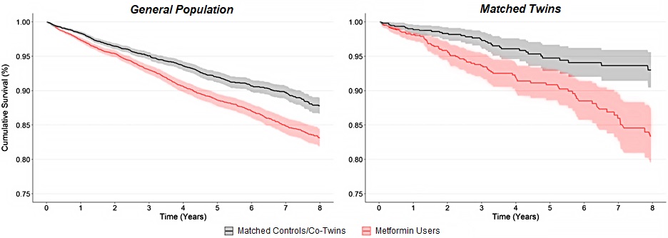 The second new study tested the question from several different angles. In one analysis, they applied the Bannister study’s flawed analysis to their independent population of nearly half a million Dutch people. In another, people who started on metformin but required new or additional diabetes drugs in the analysis were kept in the metformin group (as they should have been) and were compared directly to people who had used other diabetes drugs or no diabetes drugs at all. And in a third analysis, they controlled for the effects of genetics and family background by comparing the survival of twins in whom one twin had gone on metformin while their co-twin of the same sex had either used other diabetes drugs or no diabetes drugs at all.