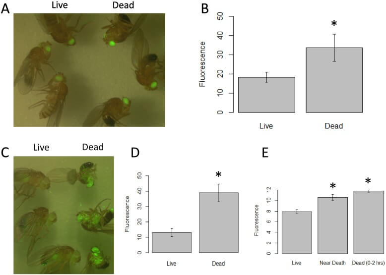 An unknown fluorescent material suddenly appears in the eyes and bodies of Drosophila just before they die. Credit: Exp Gerontol 126: 110707.