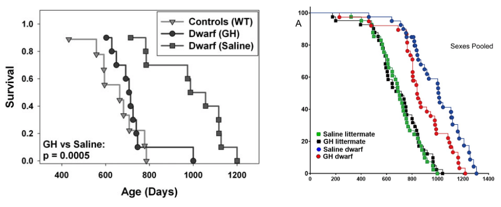 Instead, studies have shown that almost all the benefit of the “Ames mutation” goes away if growth hormone production is brought back to normal during the very earliest period of life — before the mouse has even stopped suckling its mother, let alone developed into a mature adult. After that, it’s too late to benefit from low growth hormone levels: female Ames mice live no longer than normal mice, and male mice only a little longer, despite being in in a low-growth hormone state throughout adolescence and adulthood.