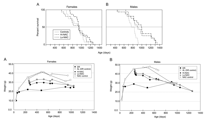 NAC may have a very small longevity benefit in male mice, though not in females. But might it be due to the supplement causing them to lose their appetites? Credit: J Gerontol A Biol Sci Med Sci 65(12):1275-84.