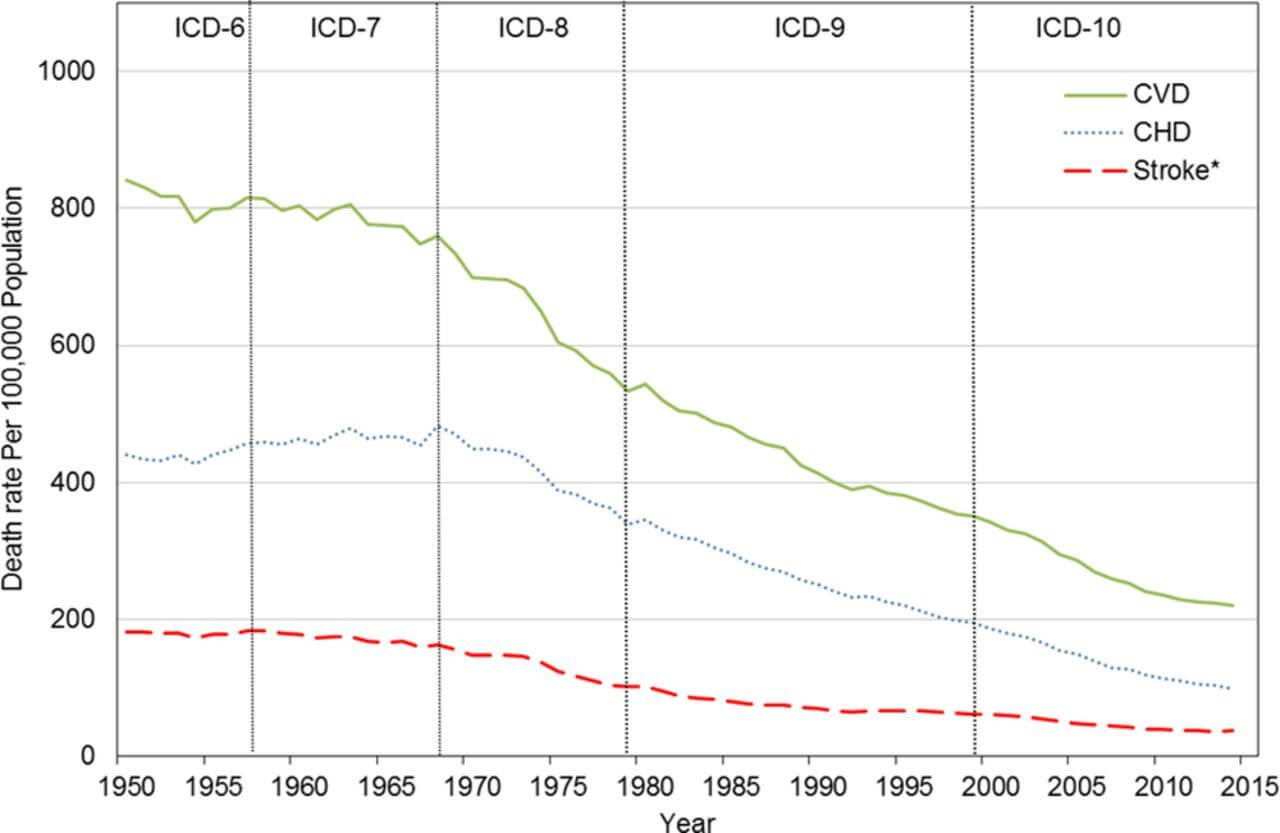 The initial good news is that deaths from “heart disease” have fallen precipitously. From their smoking-driven peak in the 1950s until the early 2010s, we cut the rate at which people died from “heart disease” by more than 70%, and have kept them at the same overall low rate since then. Lower smoking rates, lower intake of saturated and trans-fatty acids, statins, and blood pressure medications take the lion’s share of the credit for this remarkable progress.