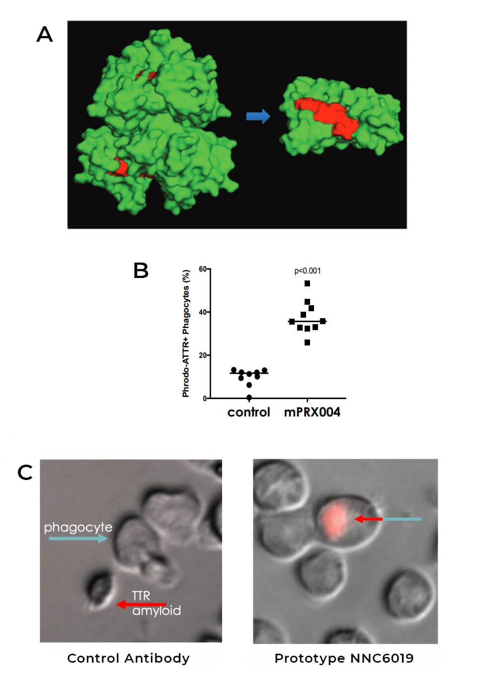 Prothena developed NNC6019 by immunizing mice with a short stretch of TTR protein that is normally shielded from the immune system through its appropriate folding, but which can be exposed when TTR has twisted out of its normal conformation. They then harvested the antibodies the mice produced in response to the normally-shielded fragment and screened them for properties that would make an antibody useful as an AmyloSENS therapy for TTR amyloidosis. Four of the isolated antibodies selectively bound to TTR that had dropped out of its normal cloverleaf structure and could prevent single TTR units from sticking together to form fibrils of amyloid. They also could “feed” the abnormal TTR proteins or aggregates to macrophages for elimination. And most importantly, the prototypes of NNC6019 excised TTR amyloid from heart tissue donated from patients with either genetic or aging-driven TTR cardiac amyloid while leaving normal heart, liver, pancreas, and brain tissue alone.