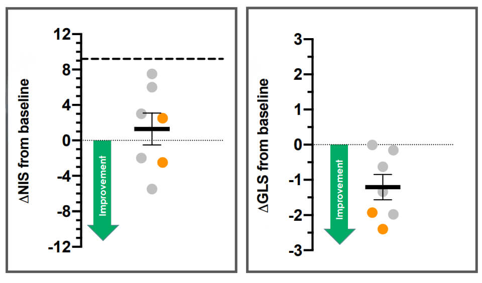 This may mean that it takes a while for the heart muscle to recover after amyloid is removed, or that the muscle is only able to recover once some minimum amount of amyloid has been removed. Either way, it’s a great sign that removing TTR amyloid has a real, functional benefit to the health of the aging heart.
