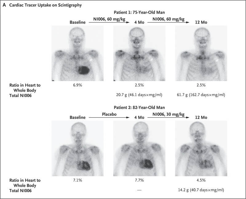 We can’t fully hang our hats on the results of a study with so few patients — but all the results they did see were encouraging. In just the initial four months of treatment, imaging scans of volunteers who got real NI006 showed that much of the amyloid that had invaded their heart muscles had been cleared out — and the amyloid continued to disappear as they continued to receive NI006 during the eight months of all-comers treatment.