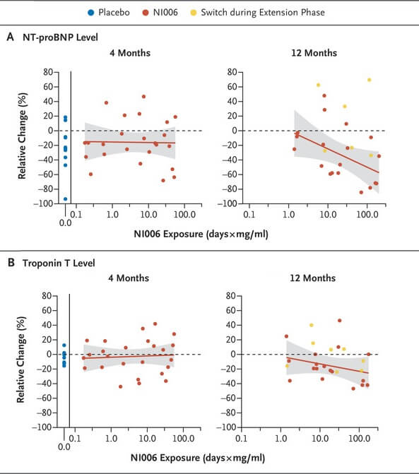 The investigators also measured blood biomarkers of heart muscle damage in the volunteers — and while the results had a lot of noise, the data are consistent with a therapeutic effect of removing amyloid. Nothing much changed for the first four months of treatment with either NI006 or the placebo. But after an additional eight months of treatment, both markers of cardiac injury began to trend downward — and promisingly, the improvements were greatest in people who had received higher doses of NI006 from the outset. (Look at the Figure below, and compare the number of people who took NI006 from the beginning (represented by the red dots) that either hug the overall trend line or are even below it, versus how many who were originally on placebo who had to wait until the extension phase to get NI006 (the yellow dots) and are above the trend line, with many having enjoyed no reduction in damage markers at all).
