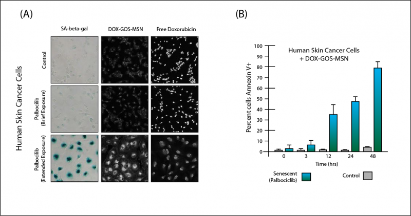 GOS-MSN loaded with doxorubicin (DOX-GOS-MSN) passed harmlessly through three non-senescent cancer cell lines, and only released their payload in a small percentage of cells of the same lines that were exposed to palbociclib too briefly to induce widespread senescence (Figure 2(A)). The nanoparticles also had minimal drug release in a fourth line that had been exposed to palbociclib, but which lacks a gene necessary for the drug to induce senescence. But when cancer cells were exposed to palbociclib for long enough to force them into senescence en masse, they lit up with doxorubicin fluorescence (Figure 2(A)), and programmed cell death raged through the population (Figure 2(B)). Meanwhile, pure doxorubicin exhibited no such selectivity, hitting every cell type across the board (Figure 2(A)).