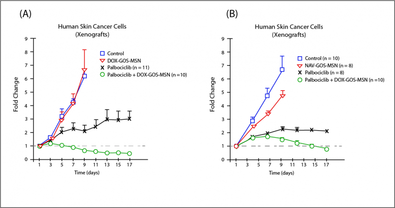 The scientists then tried the doxorubicin-loaded GOS-MSN in vivo, in mice that had been implanted with human tumors and then treated with palbociclib. Implanted tumors grew rapidly in untreated mice — and because there were few senescent cells in the tumors, DOX-GOS-MSN alone provided no defense against their growth. Palbociclib alone very substantially slowed the tumor’s growth, implying a massive conversion of formerly rapidly-dividing cancer cells into senescent ones (since that’s how palbociclib fights cancer) (Figure 3).23
