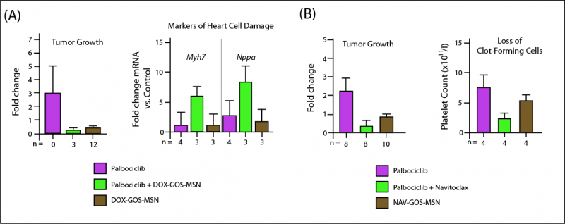 Indeed it could! Mice with implanted tumors were first treated with palbociclib, and then with either doxorubicin or Navitoclax — and those, either in “naked” form or sealed up inside GOS-MSN. The two drugs were equally effective at further shrinking the mass of implanted tumor whether they were delivered by direct injection or packaged up in GOS-MSN. But as conventionally delivered, the two drugs caused predictable toxicity to heart muscle cells (DOX) and life-threatening die-off of normal platelets (Nav) (Figure 4). But when packaged up in GOS-MSN, doxorubicin was harmless to the heart (left) and Navitoclax spared most platelets (right) (Figure 4)).23