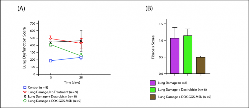 Figure 5. Doxorubicin targeted to senescent cells by GOS-MSN, but not untargeted doxorubicin, normalize lung dysfunction (A) and greatly reduce lung fibrosis (B) in a mouse model of idiopathic pulmonary fibrosis. Redrawn from (23), Figure 4 (B) and (C).