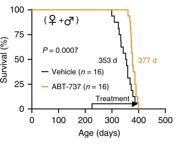 This isn’t just a reasonable prediction from first principles: it has proof-of-concept. In an animal study, scientists destroyed large numbers of the senescent-like cells in the tissues of mice with the same mutation as HGPS patients engineered into their genome. Treatment with a senolytic drug alleviated several of their aging-like health problems, greatly lowering their severe inflammation, allowing them to gain weight more normally, and increasing their terribly short life expectancy.