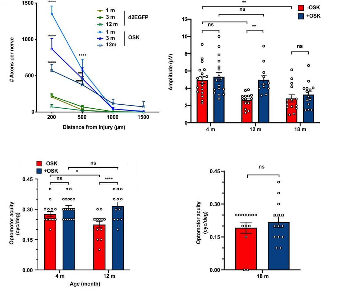 Reprogramming factors (OSK) were progressively less effective at protecting and restoring visual nerve integrity and function as mice aged. Credit: Nature 588(7836):124-129.