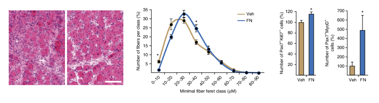 Restoration of fibronectin to the aged ECM increases the number of proliferating early muscle progenitors and muscle stem cells, and partially rejuvenates muscle repair after injury. Credit: Nature Med 22(8): 897–905.