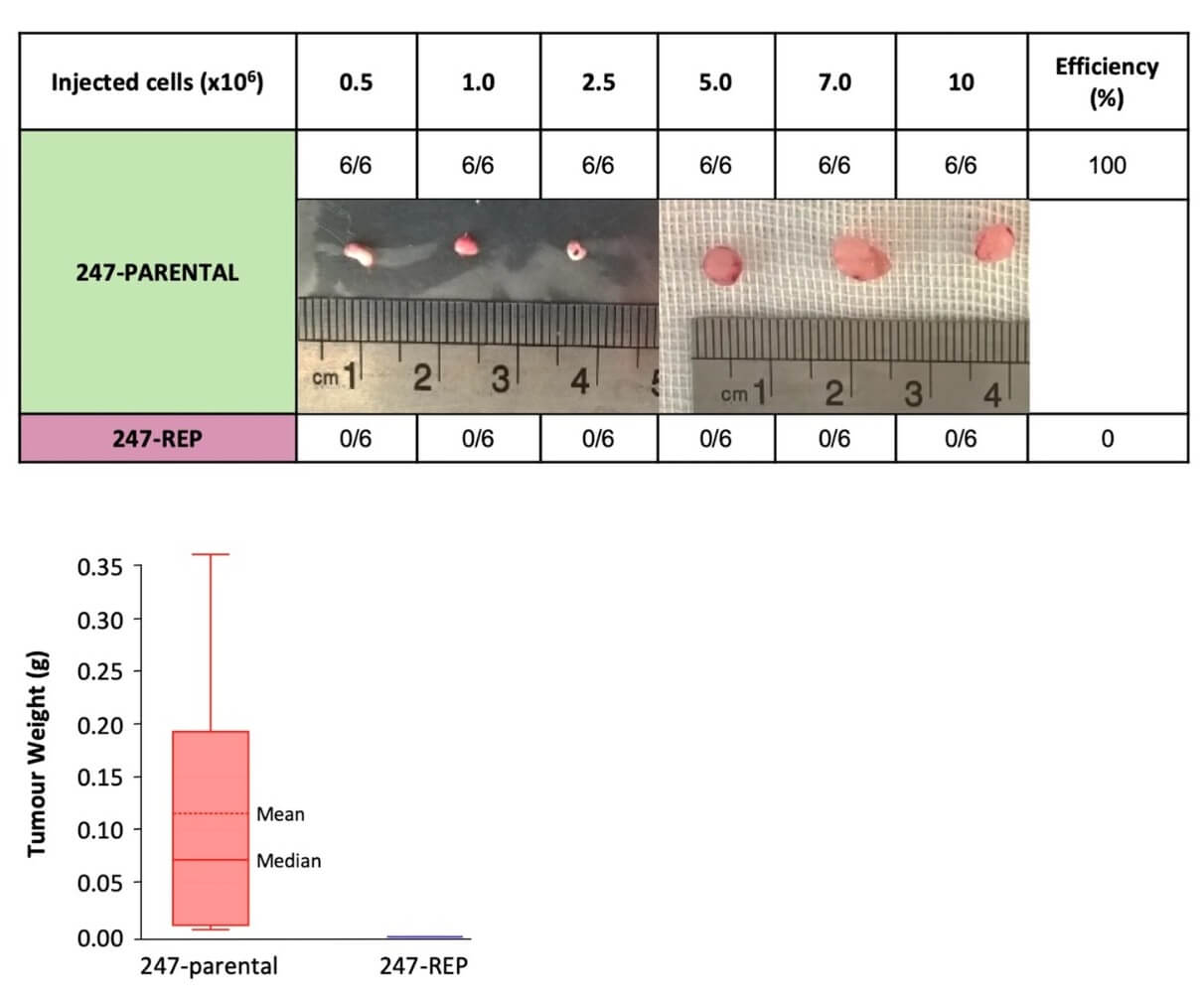 Reprogramming pancreatic cancer cells taken from patients makes them far less likely to form tumors when implanted into mice. 247-Parental = unmodified cultured patient cancer cells. 247-REP = reprogrammed cells. Credit: Oncogene 38(34):6226-6239.