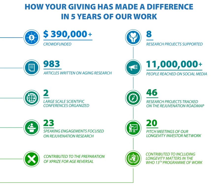 We are just getting started, and I hope that reading this report will inspire you to stand up to the diseases of aging ever further, to get involved in our mission any way you can, and to fight for our collective future and health as a society.