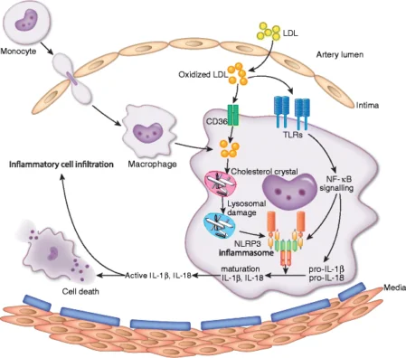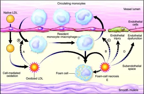 The big problem is that macrophages are unable to regulate the number of oxidized LDL particles they take up: they just keep gobbling them up as they encounter them — until they suddenly can’t take any more. By that point, their lysosomes are engorged with either the sheer quantity of cholesterol from the unregulated uptake of oxidized LDL particles, or from the direct toxicity of oxidized cholesterol byproducts and other materials they can’t break down. As their lysosomes fail, arterial macrophages become dysfunctional and immobilized in the artery wall, and ultimately die outright. As sick and dying macrophages in the artery wall accumulate over time, the injury swells and festers, becomes inflamed and unstable, and eventually bursts, its contents spewing out and triggering clots that result in heart attacks and strokes.