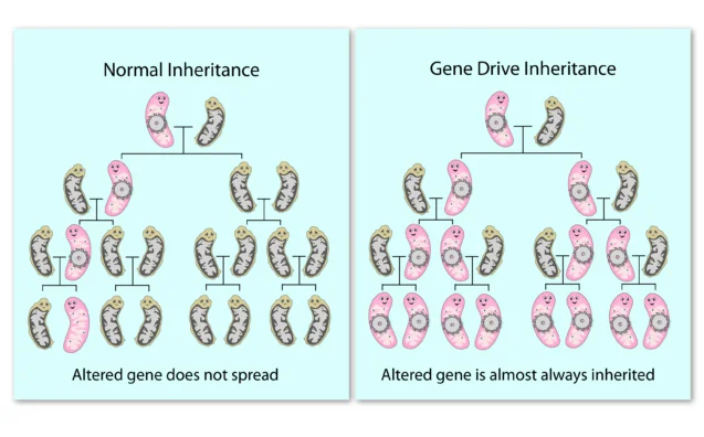 Additionally, many gene drives work by hijacking the cellular DNA repair machinery to replace the severed stretch of non-engineered, native DNA with a copy of the engineered gene sequence that is encoded on the opposite strand of the double helix of DNA. But mitochondrial DNA is single-stranded, so this specific approach won’t work. Instead, the mitochondrial gene drive relies on a “slash-and-burn” agriculture approach: clear the field by destroying the pre-existing mitochondrial genomes outright, and leave the engineered genome to spread across the genetic scorched earth.
