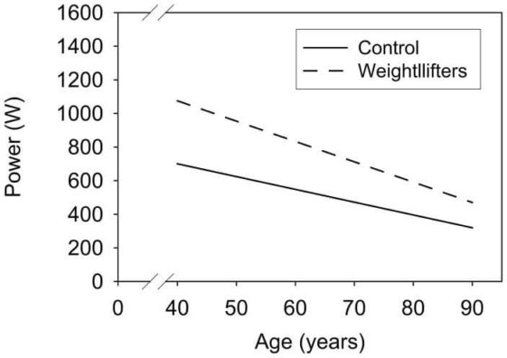 Both sedentary adults (solid line) and elite Master-class weight-lifters (dashed line) lose muscle power with age. Lifelong exercise sustains a higher level of strength and power, but the rate of loss may be faster in trained persons. Credit: Clin J Sport Med 18(6): 501–507, with data from Pearson et al., 2002.