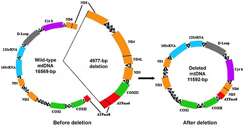 The 4977 base pair “common deletion” that accumulates in some aging cells encodes all of the mitochondrial tRNAs and the genes for seven subunits of the mitochondrial electron transport chain. Credit: Oncol Rev 13(1): 409.